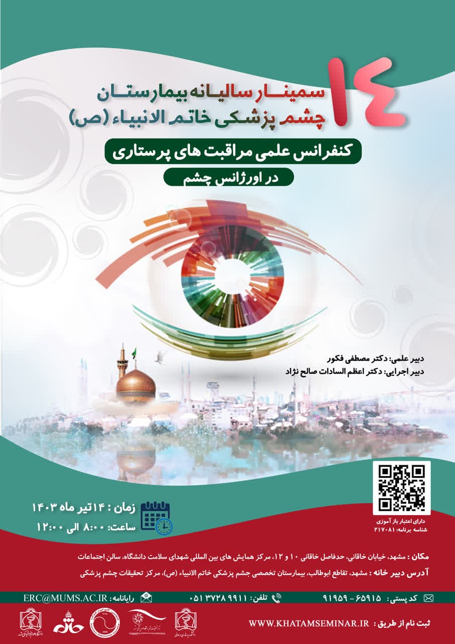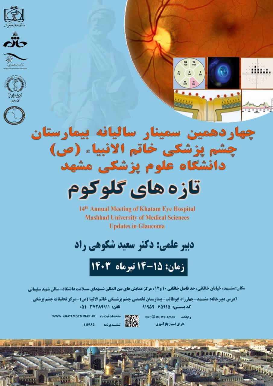 چهاردهمین سمینار سالیانه تخصصی چشم پزشکی بيمارستان خاتم الانبياء (ص) مشهد با عنوان «تازه های گلوکوم» در مجتمع شهدای سلامت دانشگاه علوم پزشکی مشهد برگزار گردید.