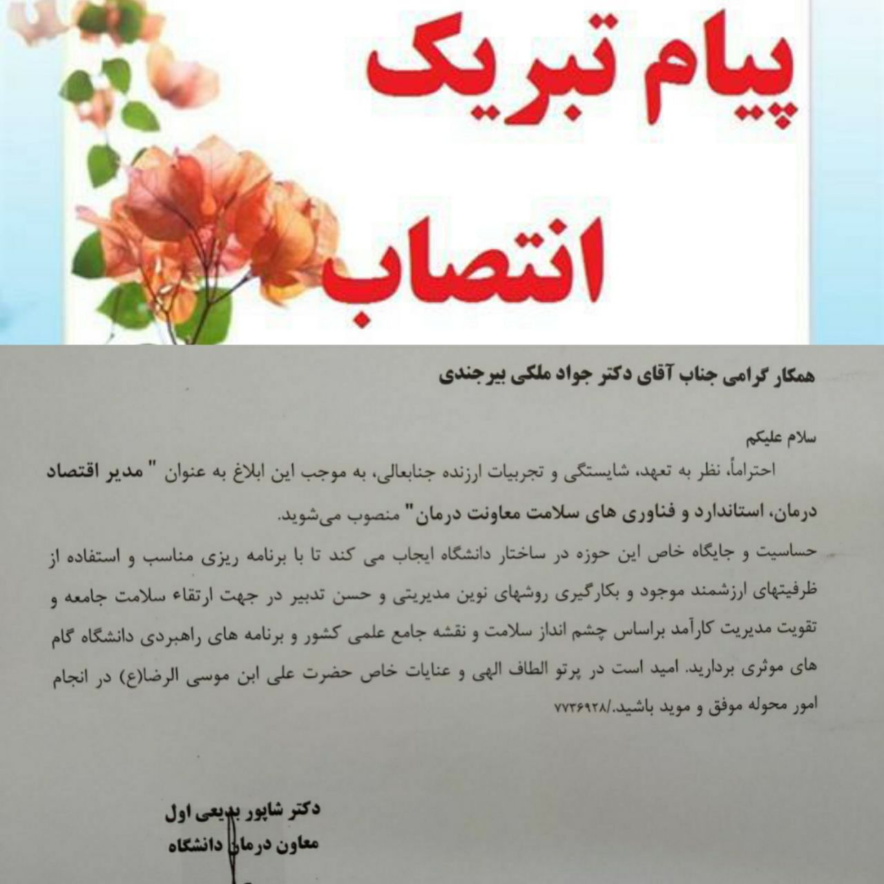 انتصاب شایسته ی جنابعالی بعنوان "مدیر اقتصاد،درمان،استاندارد و فناوری های سلامت معاونت درمان" دانشگاه علوم پزشکی مشهد را تبریک و تهنیت عرض می نماییم.