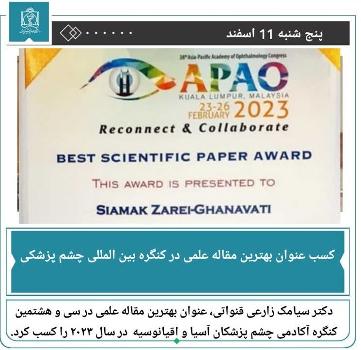 استاد دانشگاه علوم پزشکی مشهد،عنوان بهترین مقاله علمی در سی و هشتمین کنگره آکادمی چشم پزشکان آسیا و اقیانوسیه در سال ٢۰٢٣ را کسب کرد.